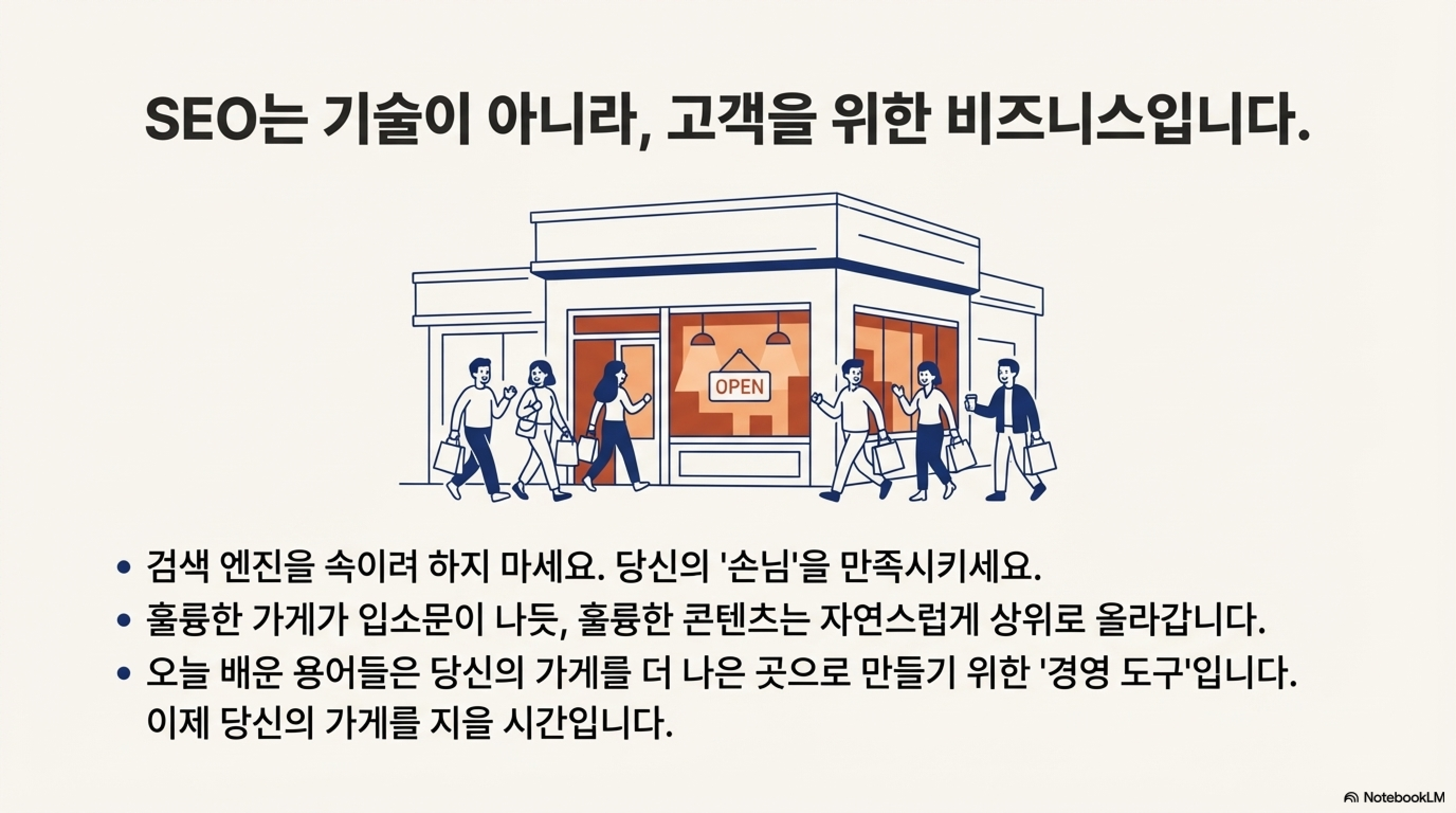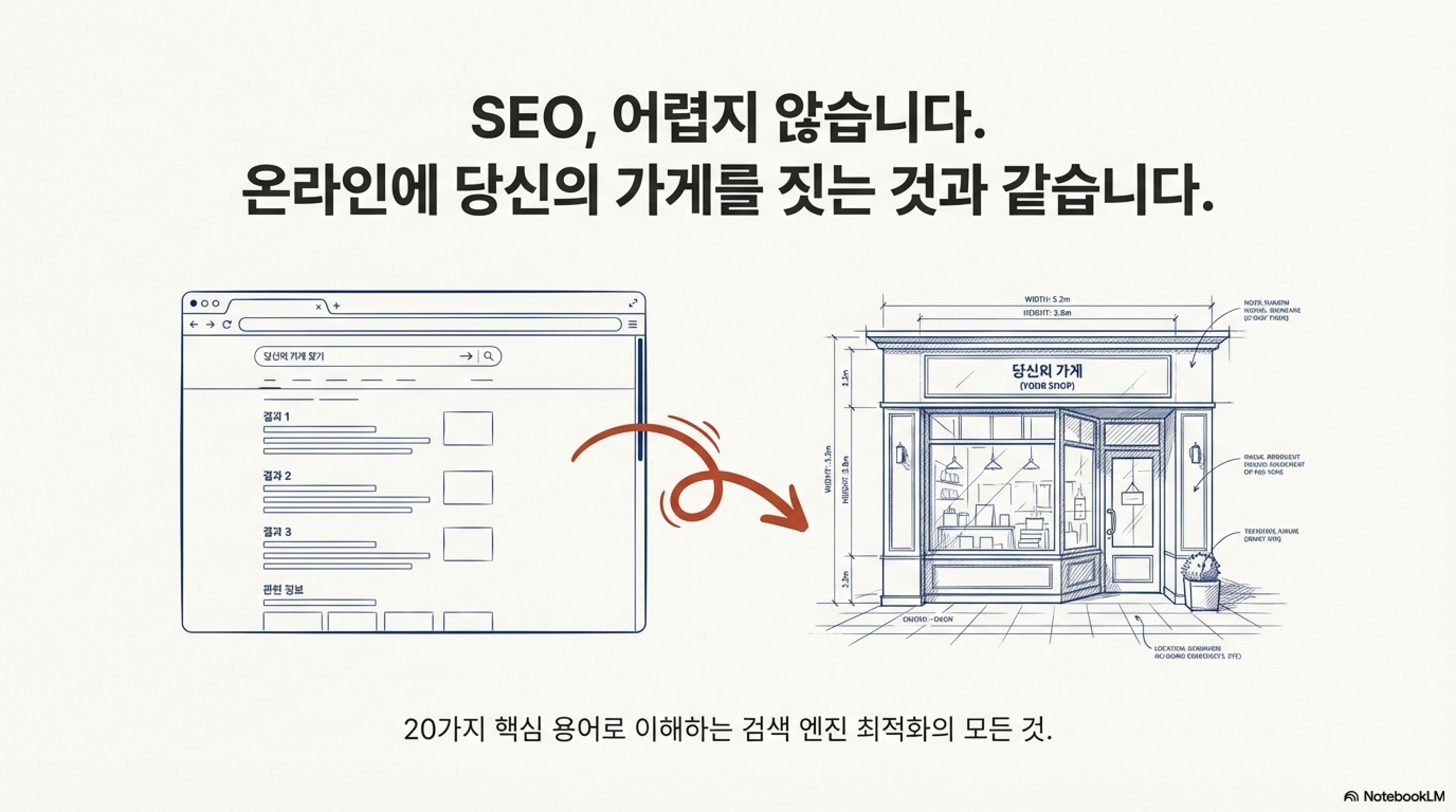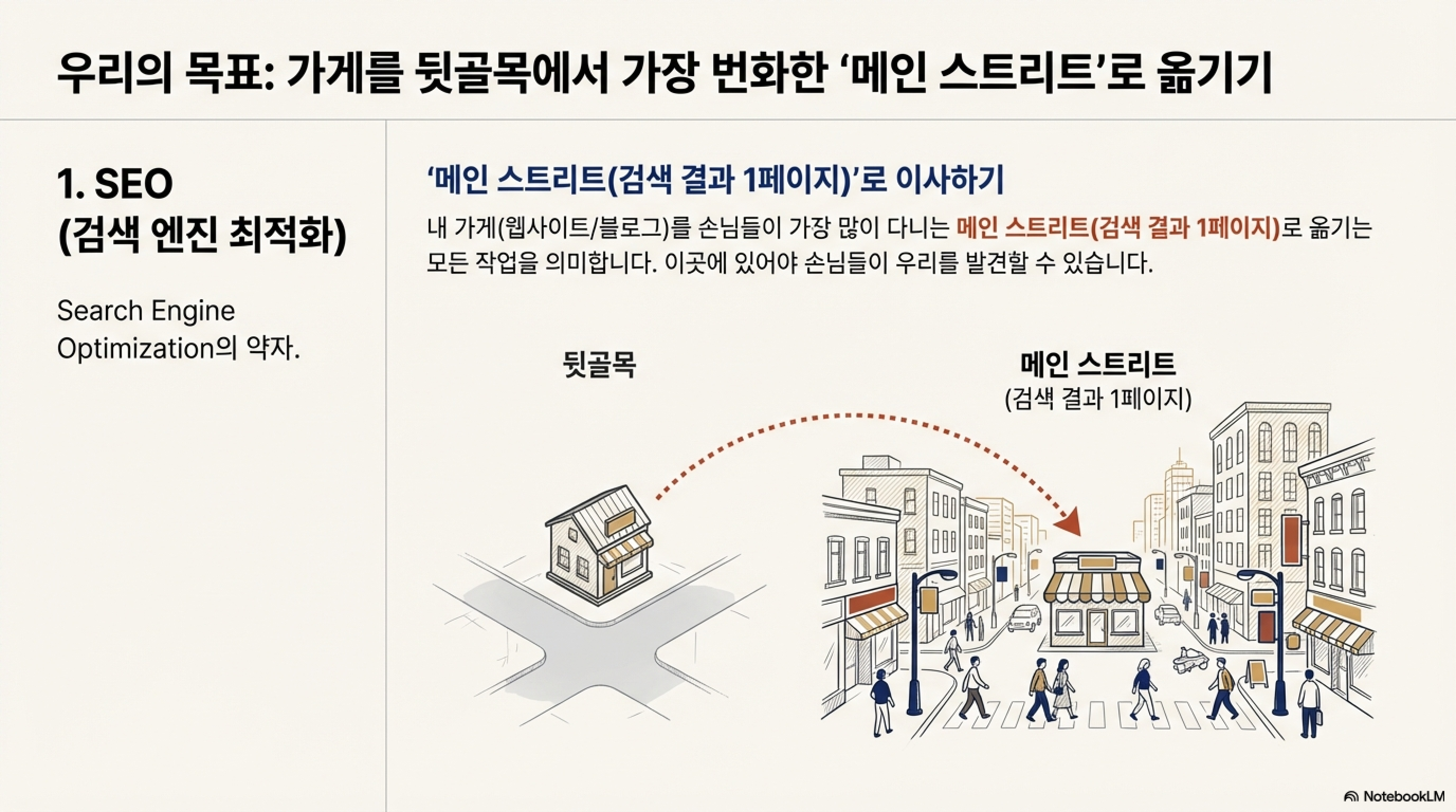 - 쉽게 설명하면: 내 가게(웹사이트/블로그)를 손님들이 가장 많이 다니는 **메인 스트리트(검색 결과 1페이지)**로 옮기는 작업입니다.