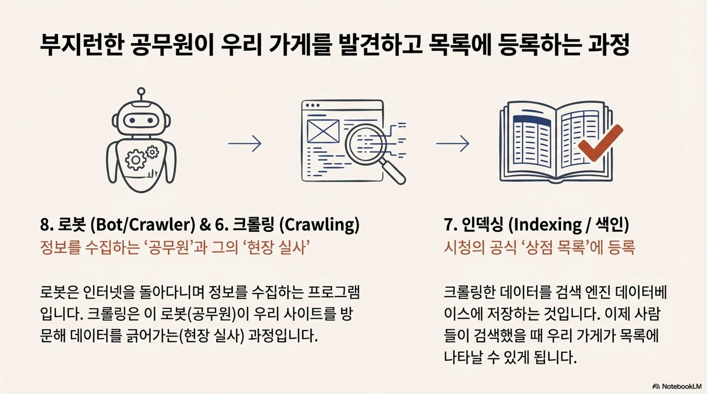 - 의미: 검색 엔진 로봇(크롤러)이 내 사이트를 방문해서 데이터를 긁어가는 과정.