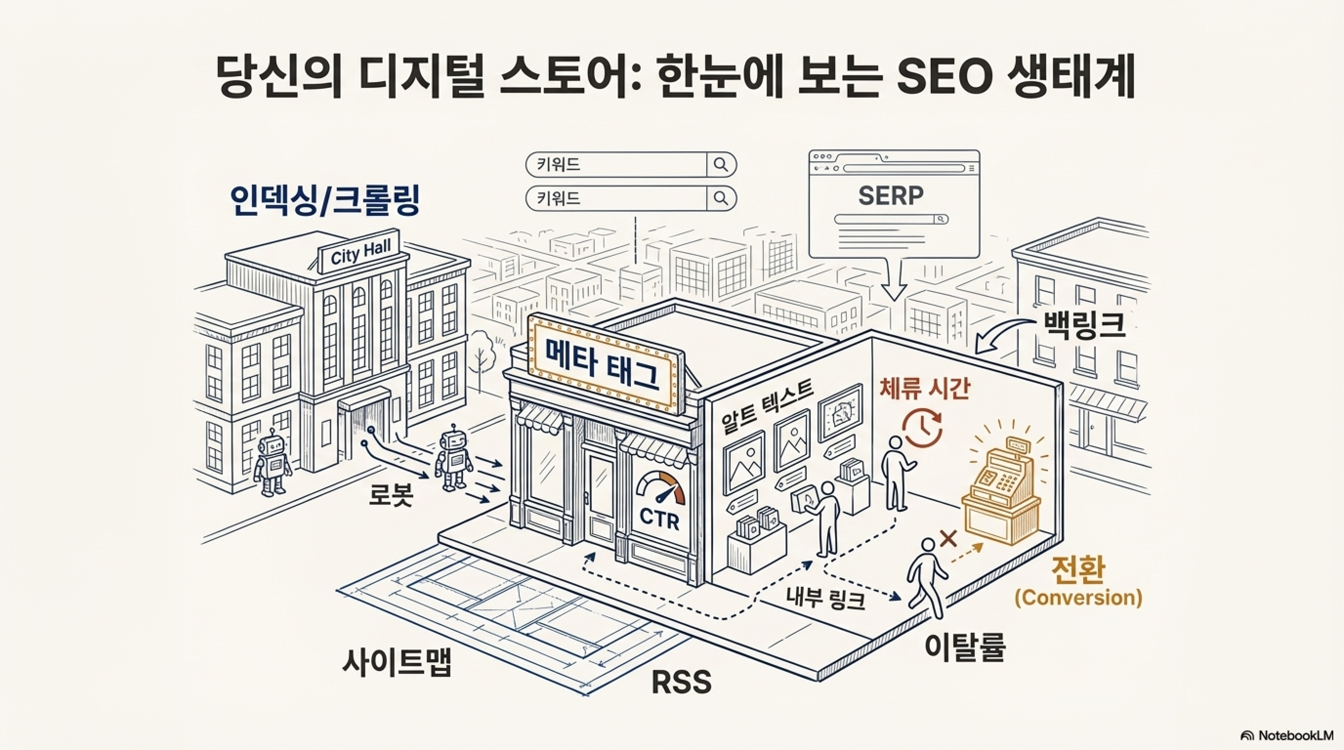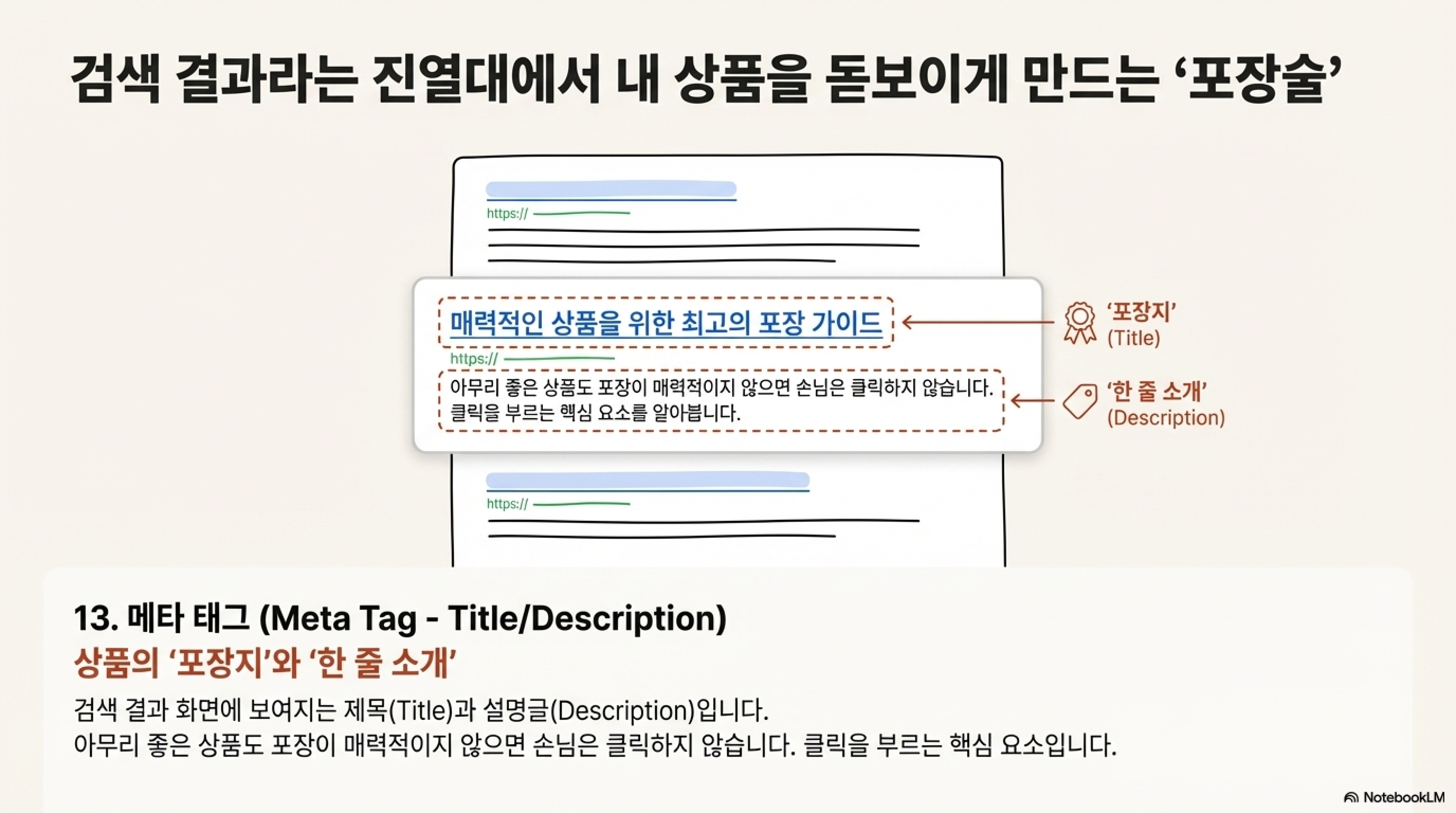 - 쉽게 설명하면: 검색 결과라는 진열대에 놓일 내 상품의 **'포장지'와 '한 줄 소개'**입니다. 클릭을 부르는 핵심 요소입니다.