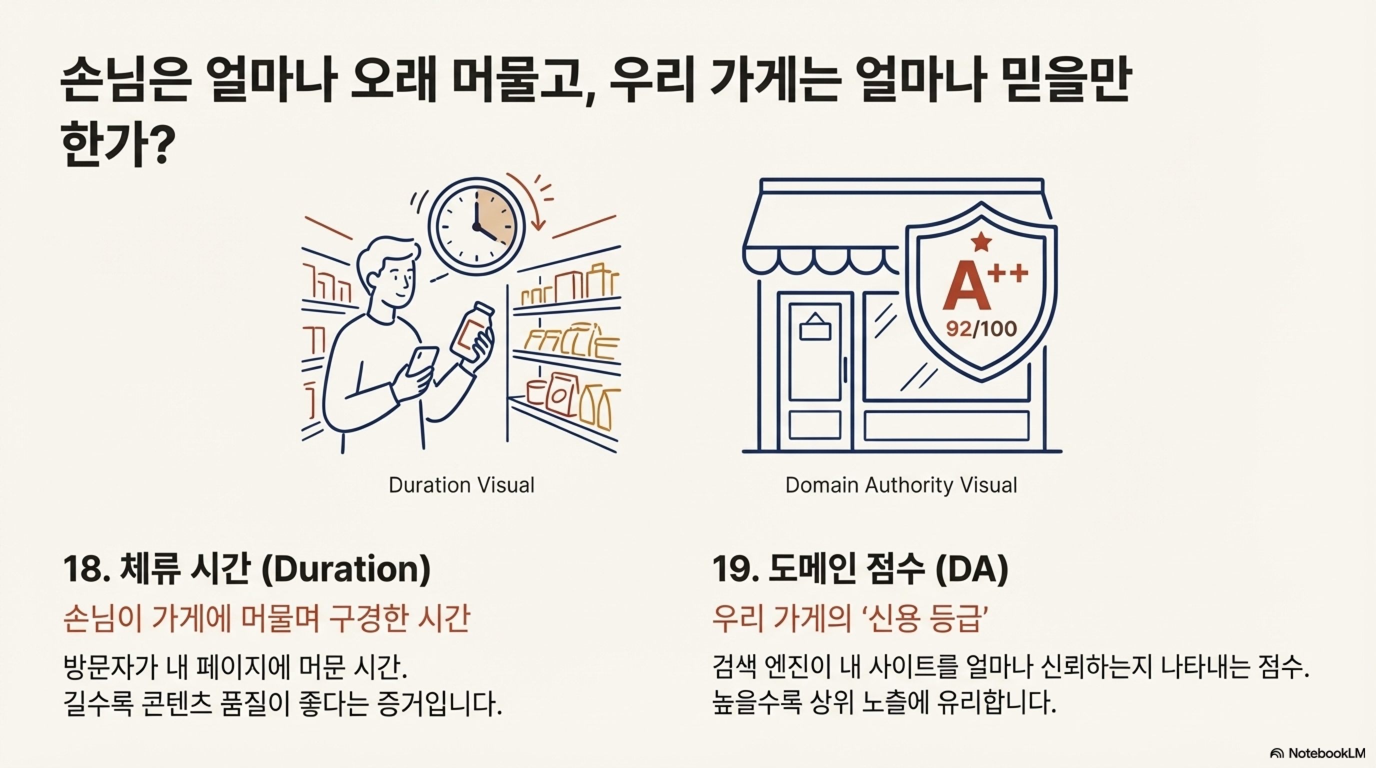 - 쉽게 설명하면: 손님이 가게에 얼마나 오래 머물며 구경했는지입니다. (길수록 콘텐츠 품질이 좋다는 뜻)