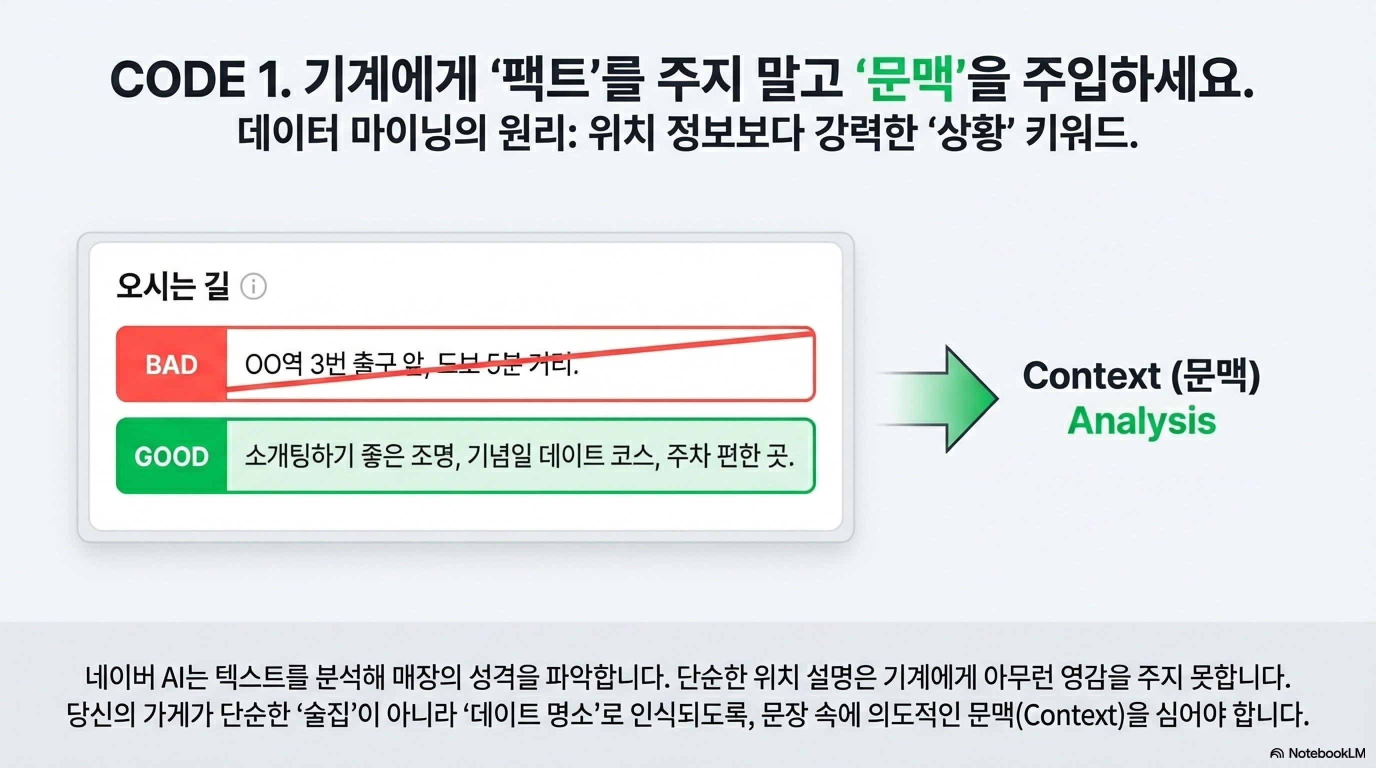 1. '팩트'가 아니라 '문맥'을 입력하세요 (데이터 마이닝의 원리) 대부분의 사장님은 '오시는 길'에 "OO역 3번 출구 앞"이라고만 적습니다. 이건 하수입니다. 네이버 AI는 텍스트를 분석해 매장의 성격을 파악합니다. 만약 당신이 분위기 좋은 와인바를 운영한다면, 단순 위치 설명 대신 "소개팅하기 좋은 조명", "기념일 데이트 코스", "주차 편한 곳" 같은 단어를 문장에 자연스럽게 녹여야 합니다. 기계가 당신의 가게를 단순한 '술집'이 아니라 '데이트 명소'로 인식하게 만드는 밑작업입니다.
