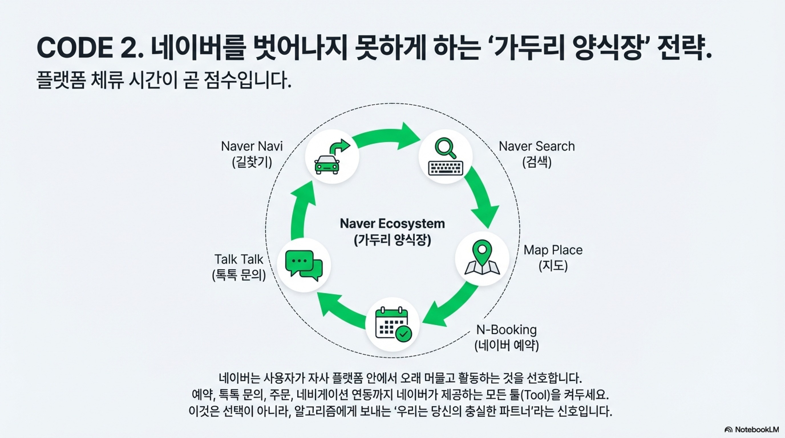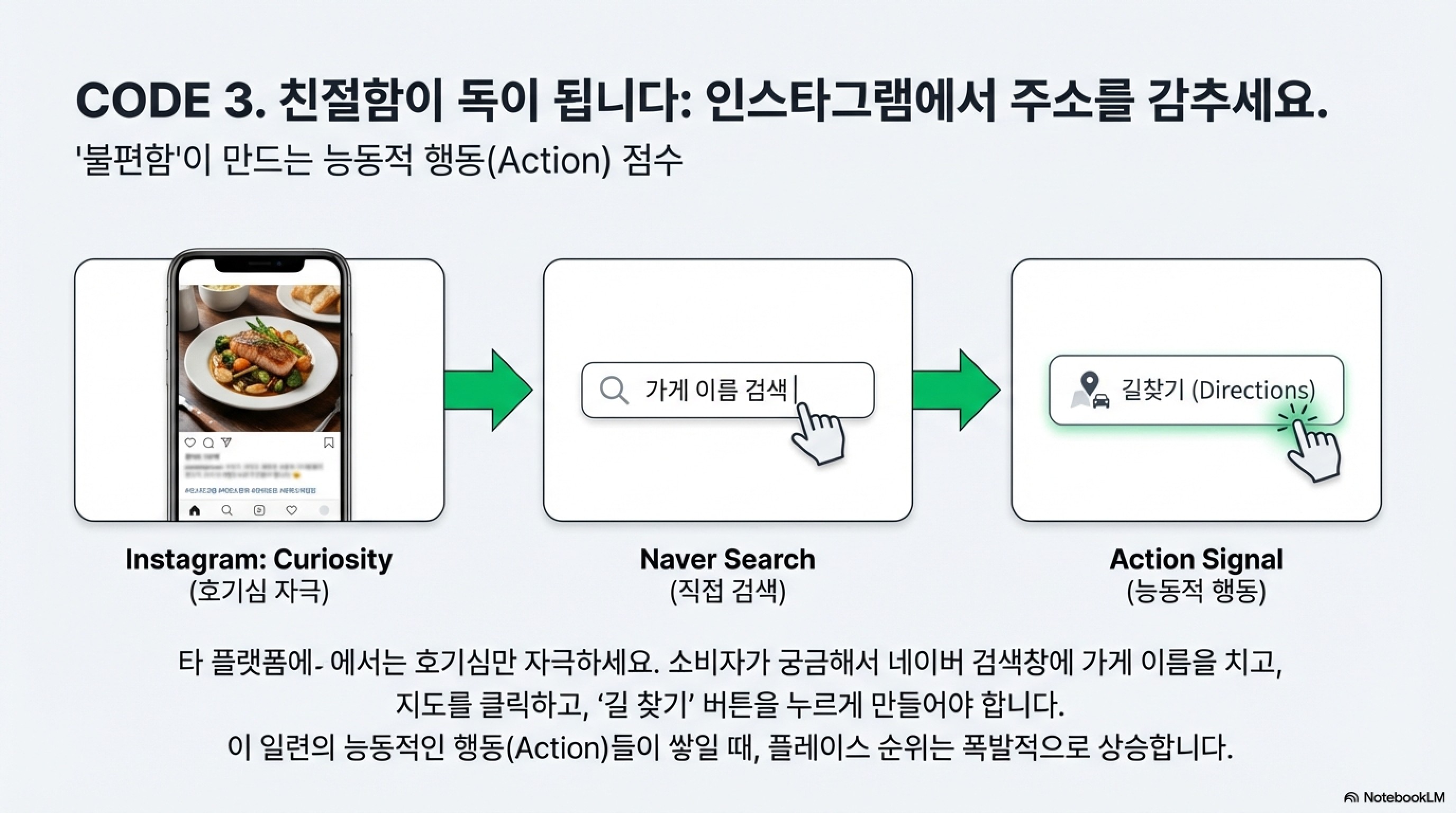 2. 네이버를 '가두리 양식장'으로 만드세요 네이버는 자사 플랫폼 안에서 사용자가 오래 머물고 활동하는 것을 좋아합니다. 예약, 톡톡 문의, 주문, 네비게이션 연동까지 네이버가 제공하는 툴은 하나도 빠짐없이 켜두세요. 특히 인스타그램이나 당근마켓에서 홍보할 때, 친절하게 주소를 다 적어주지 마세요. 소비자가 궁금해서 네이버 검색창에 가게 이름을 치고, 지도를 클릭하고, '길 찾기' 버튼을 누르게 유도해야 합니다. 이 일련의 능동적인 행동(Action)들이 쌓일 때 점수는 폭발적으로 상승합니다.
