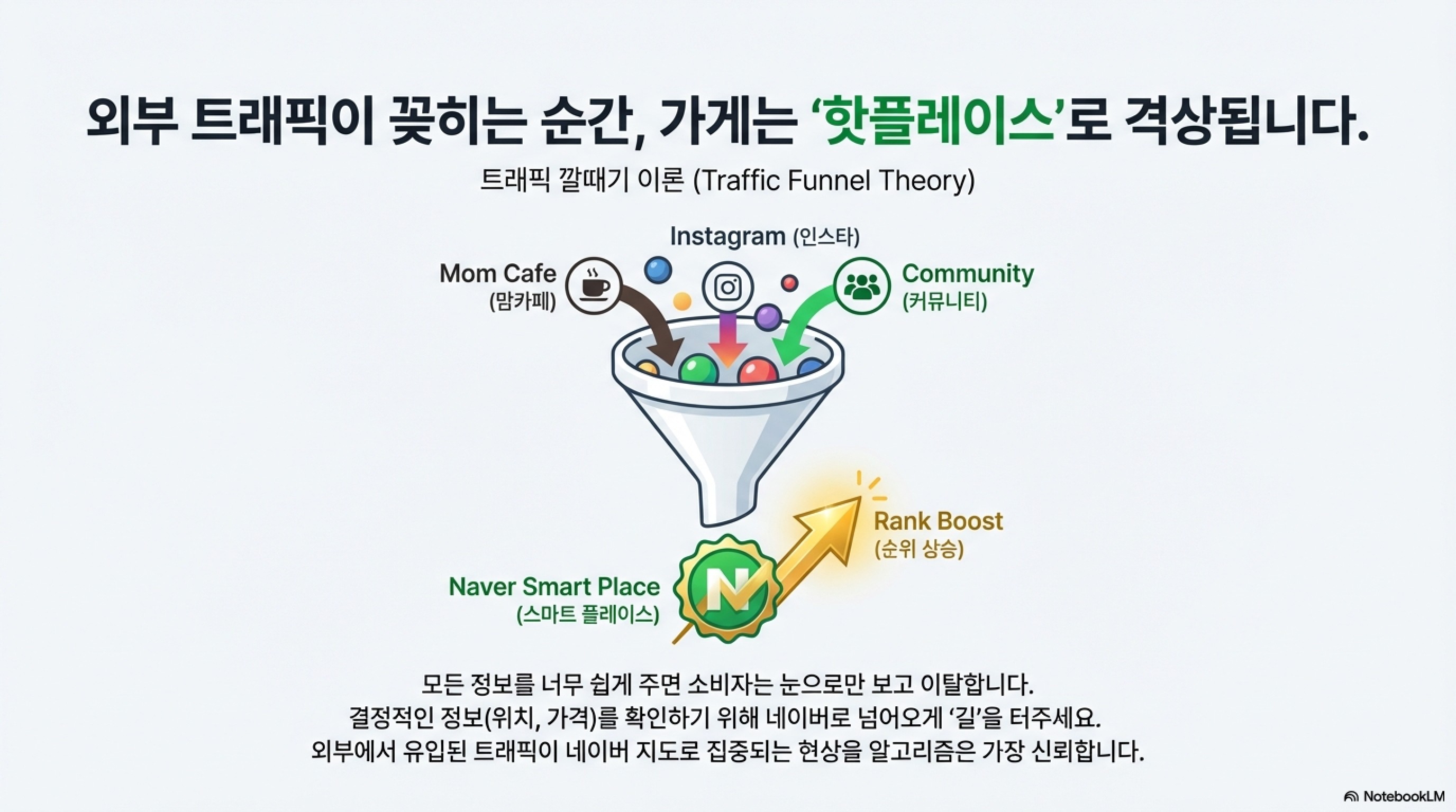 3. '불편함'이 순위를 만듭니다 (트래픽 깔때기 이론) 모든 정보를 너무 쉽게 주면 소비자는 눈으로만 보고 이탈합니다. 앞서 말했듯 타 플랫폼(SNS, 커뮤니티)에서는 호기심만 자극하고, 결정적인 정보(위치, 가격)를 확인하려면 네이버 플레이스로 넘어올 수밖에 없게 길을 터주세요. 지역 맘카페나 동호회에서 유입된 트래픽이 네이버 지도로 꽂히는 순간, 알고리즘은 이 가게를 '외부에서도 주목하는 핫플레이스'로 격상시킵니다.