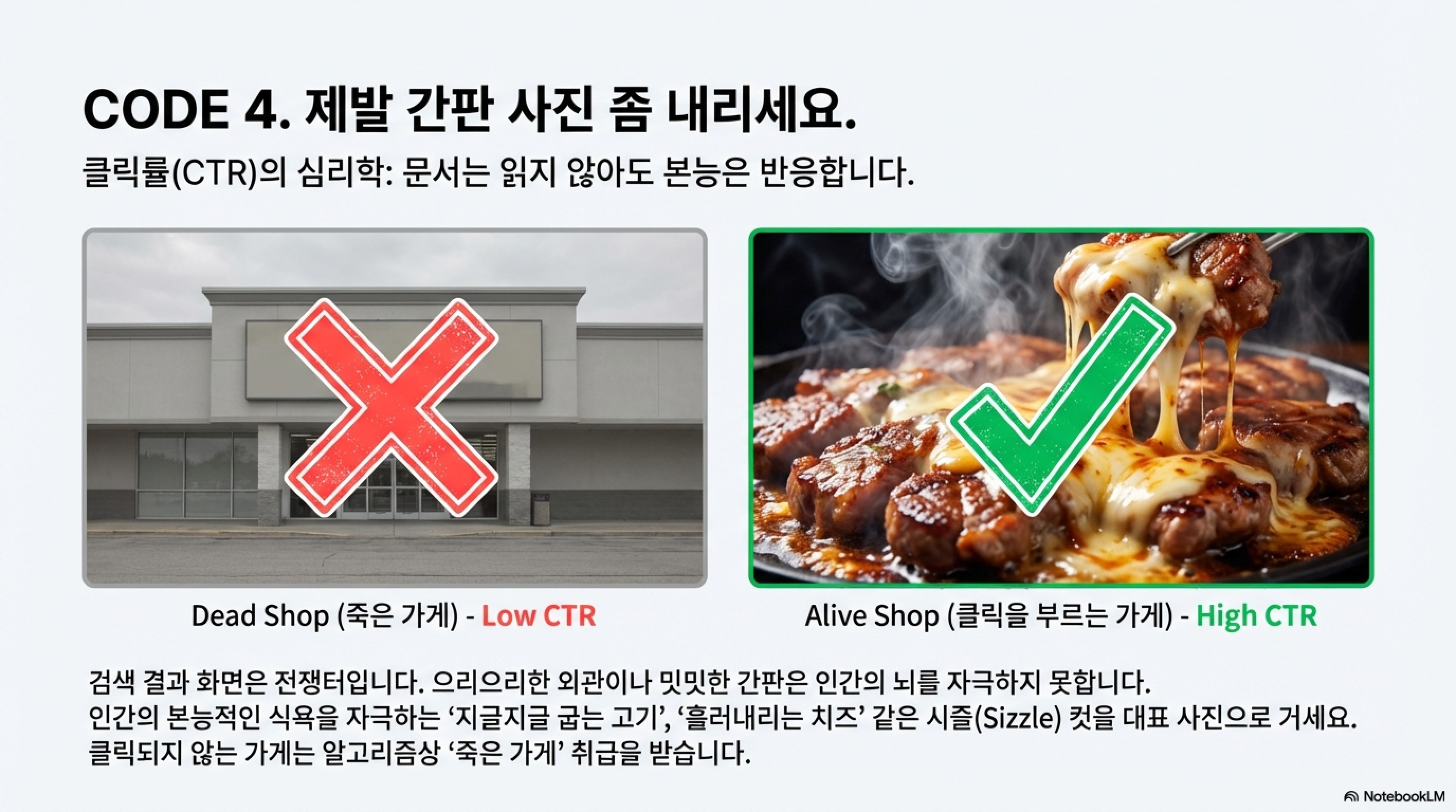 4. 간판 사진 제발 내리세요 (클릭율의 심리학) 검색 결과 화면은 전쟁터입니다. 옆 가게들이 으리으리한 건물 외관이나 밋밋한 간판 사진을 걸어두었나요? 그렇다면 당신은 **'지글지글 굽는 고기 클로즈업'**이나 '크림이 흘러내리는 라떼' 사진을 거세요. 인간의 뇌는 본능적인 욕구를 자극하는 이미지에 먼저 반응합니다. 남들과 똑같은 '증명사진' 같은 썸네일로는 절대 클릭을 유도할 수 없습니다. 클릭되지 않는 가게는 알고리즘상 '죽은 가게' 취급을 받습니다.